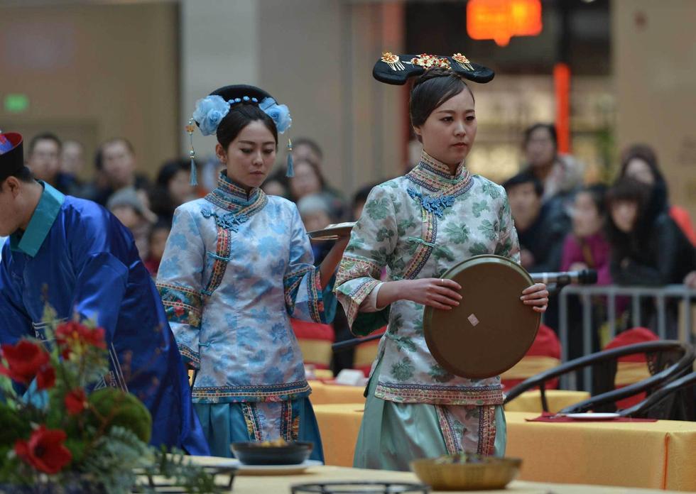 2016年3月12日,辽宁省沈阳市,一商场举办美食节上演穿越满汉全席宴,皇上皇后请百人品尝满汉全席108道菜,美女宫女高挑身材婀娜多姿递送菜品惊艳全场格外抢镜。(焉博 岳志强/东方IC)