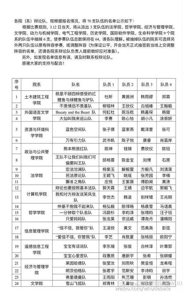 今日(12日),武汉大学辩论队官方微博“武汉大学辩论队WHU”上传了一张武汉大学辩论队名单公示图,各路奇葩的队名让一众网友笑喷。