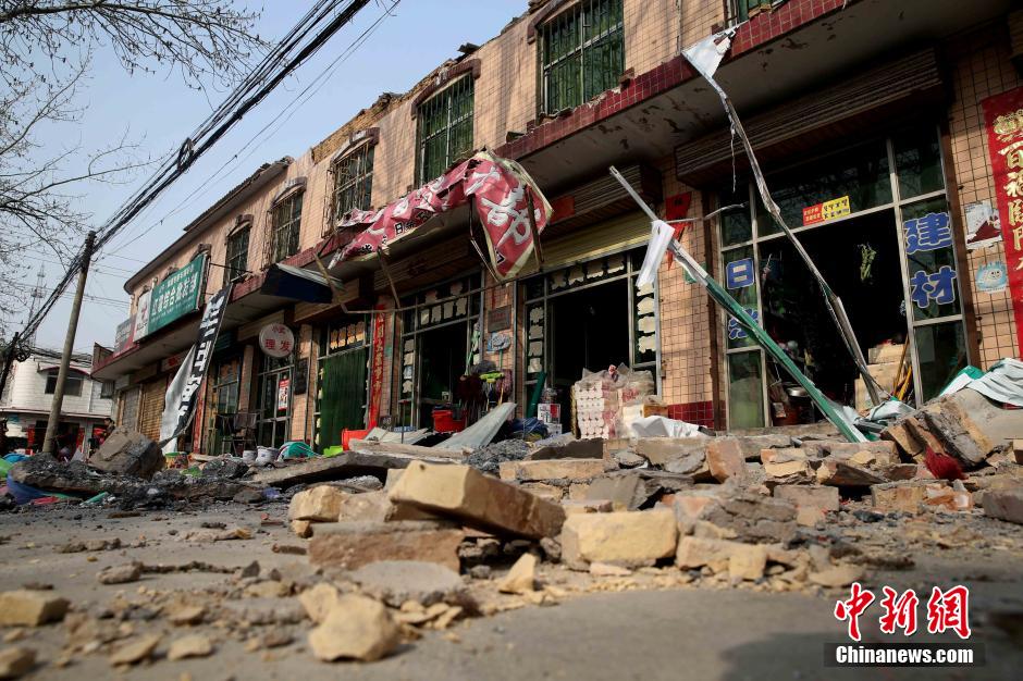 3月12日,中国地震台网正式测定:北京时间3月12日11时14分,在山西省运城市盐湖区(北纬35.00度,东经110.90度)发生4.4级地震,震源深度5千米。据当地抗震救灾指挥部最新消息显示,盐湖区共7人受伤,无死亡报告。目前当地民政部门启动灾情救助,善后工作正在进行。图为3月12日,山西省运城市盐湖区,房屋和门面房因为地震受损。 陈卫 摄