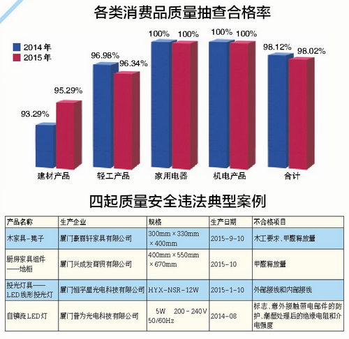 与《白皮书》一并发布的,还有2015年企业产品质量“红黑榜”及打击质量违法典型案例。全市共有60项“2015年度福建名牌产品”荣登“红榜”,4家企业因质量违法被列入“黑榜”。4个打击质量违法典型案例涉及水泥、电梯、气瓶等产品。