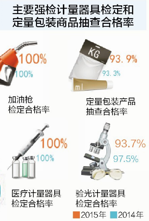 2015年,市质监局共检定加油(气)枪4212枪,检定验光计量器具898台件,检定医疗器具9468台件,合格率分别为100%、93.7%、100%,均维持较高水平。去年全年,质监部门还组织对98家生产企业开展定量包装抽查,涉及大米、食用油、肉制品、茶叶、涂料、水产加工等领域相关商品共163批次,净含量合格率为93.9%,较2014年略有提高。
