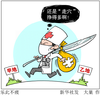 半月谈记者在一些公立医院调研发现,现在很多医生还是热衷于走穴。湖南一家三甲医院的蔡医生向记者透露:“医师多点执业本是一项工作权利,但这项权利并没有得到公立医院的尊重。我们医院暗地走穴的不少,敢跟医院说的却没有。很多医生被一些市级医院请过去做高难度手术,比如肿瘤手术、介入手术等,一般跑场费至少是7000元以上,教授的跑场费至少是1万元以上,但这些事跟自己所在的医院说不得,都只能暗地里做。”