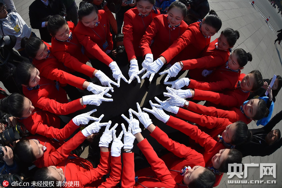 穿中国红上衣、戴白手套的美女引导员、礼仪小姐站成一个圆圈,伸出戴着白手套的手比划胜利手势,让各路摄影记者拍照留影。