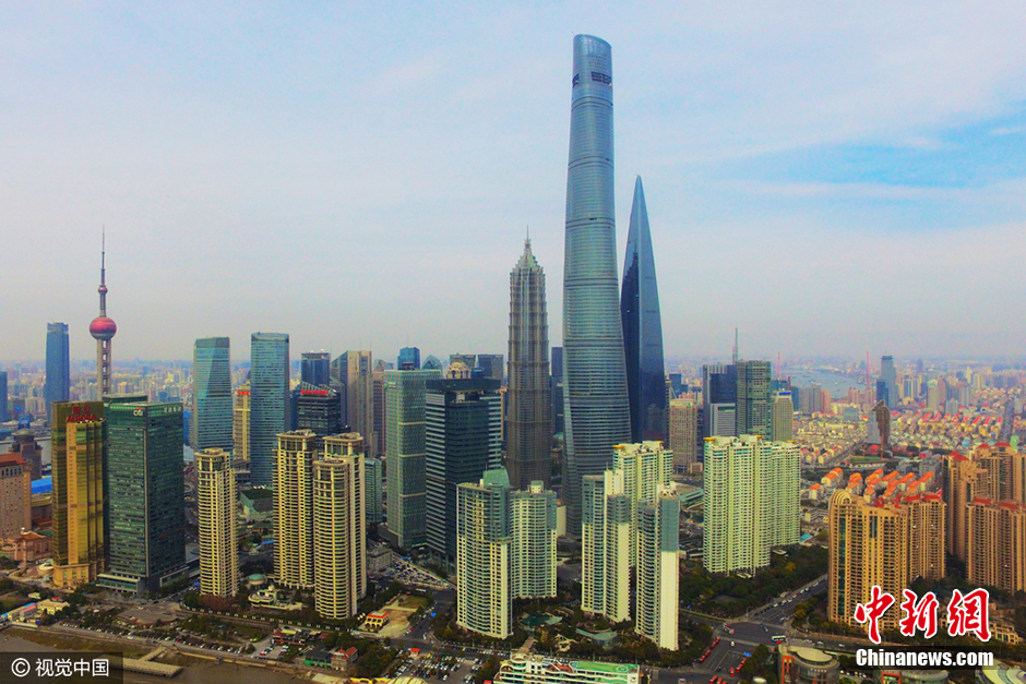 3月15日,上海,航拍镜头下的上海中心大厦(图中最高建筑)。当天,中国第一、世界第二高楼上海中心大厦已经完工,即将正式开业。 图片来源:视觉中国