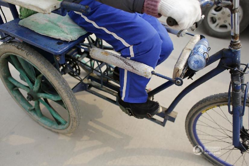 10多年来,每天早晚两次训练,每次两小时,不管刮风下雨都没有间断过,过年期间也是如此。每次蹬车可以完成4、5里地的距离,一些路人还会上前和孙一铭交流两句。时间长了,兴旺商业街附近的居民没有人不知道这个脑瘫小伙子。图为爷爷孙鹏特地在孙一铭的两腿外安装了两根钢棍用来保持两腿垂直。