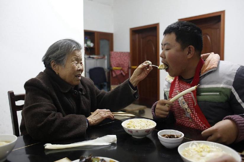 孙一铭最初只有右手能活动,左手紧握,无法伸直,通过训练,双手变得灵活起来,有时还可以自己用勺子吃饭。图为虽然有时候可以自己用勺子吃饭,但是大多时候,孙一铭吃饭还是需要奶奶彭淑霞一口一口喂。
