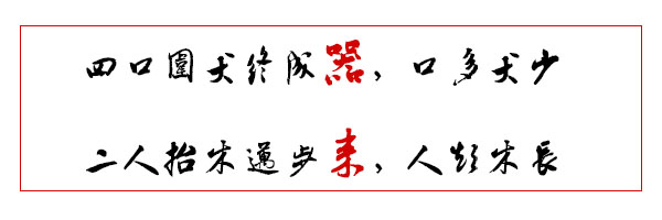 “四口围犬终成器,口多犬少;二人抬木迈步来,人短木长。”众所周知,苏轼与佛印为好友,两人留下了许多交往趣事,并广为流传。其中就有这么一则和拆字对联有关的故事。相传有一次,苏轼去找佛印,看到他正在与三个木匠围坐在一起,讨论为寺庙设计雕刻木制小狗。苏轼随口吟道:“四口围犬终成器,口多犬少。”四口人围着一只犬,就是个“器”字。而四口对一犬,正好是口多犬少。而佛印呢,也是位妙人,正巧有两人抬着木头从眼前经过,张口就说:“二人抬木迈步来,人短木长。”来的繁体写作來,可以分解为两个“人”和一个“木”,“人”字在“木”字中间,恰似两个人抬着一横木,而就其中的字体大小而言,也正好是人短木长。这样一来就与苏轼的上联完美对上,连苏轼都不禁抚掌大赞。