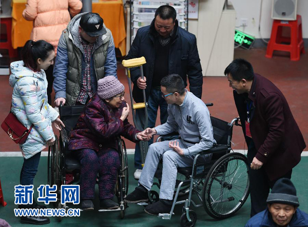 3月17日,奶奶与黄舸扮演者王峰见面后,通过手势交流。新华社记者 李尕摄