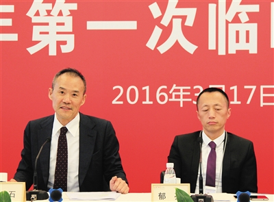 3月17日,万科董事会主席王石、总裁郁亮在万科今年第一次临时股东大会上。