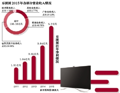 新京报讯 (记者赵嘉妮)昨日,乐视网发布2015年度财报。财报显示,去年公司实现营业收入130亿元,同比增长90.89%。归属于上市公司普通股股东的净利润为5.7亿元,较去年同期增长57.41%,是2010年(7021万元)的8.1倍。
