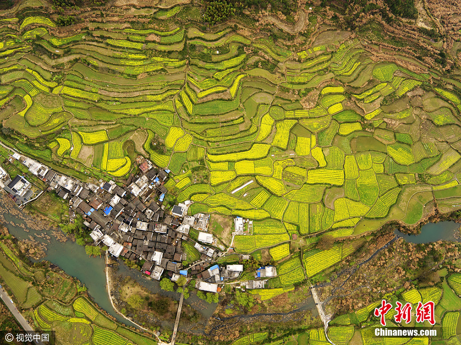 2016年3月17日,航拍江西婺源进入盛花期的梯田油菜花海。早春三月,“中国最美乡村”江西省婺源县十万亩油菜花陆续开放,金灿灿的油菜花海与白墙黛瓦的徽式民居相映,花海片片,风景独好,构成一幅优美的田园风光画卷。 图片来源:视觉中国