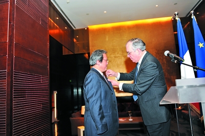 图为法国驻华大使顾山为冯远授勋。钱晓鸣摄