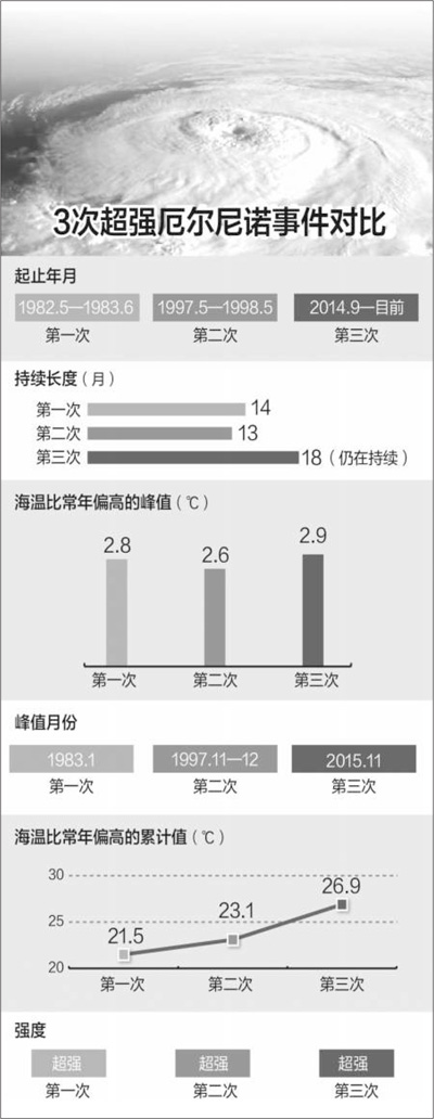 “生命史时长、累计强度、峰值强度,这三个指标都达到了历史最高,这次过程比之前发生的1982/1983年和1997/1998年这两次都强,是超强厄尔尼诺事件。”国家气候中心副主任巢清尘说。