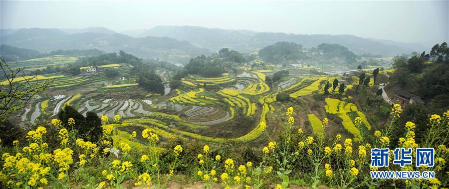 在四川省犍为县塘坝乡新房村,油菜花、李花沿着梯田一层层盛开,形成一幅美丽乡村画卷(3月17日摄)。 3月,四川省犍为县迎来赏花季,金黄的油菜花吸引不少外地游客踏青赏花。 新华社记者 江宏景 摄
