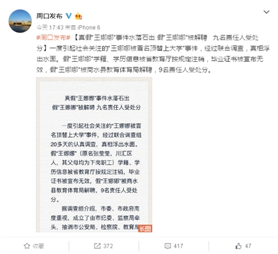 周口市委宣传部官方微博“周口发布”通报:真假“王娜娜”事件水落石出。网络截图