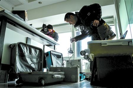 警方曾在国定东路一写字楼内查获一家涉嫌违规设立通讯基站传播广告的单位。/肖允