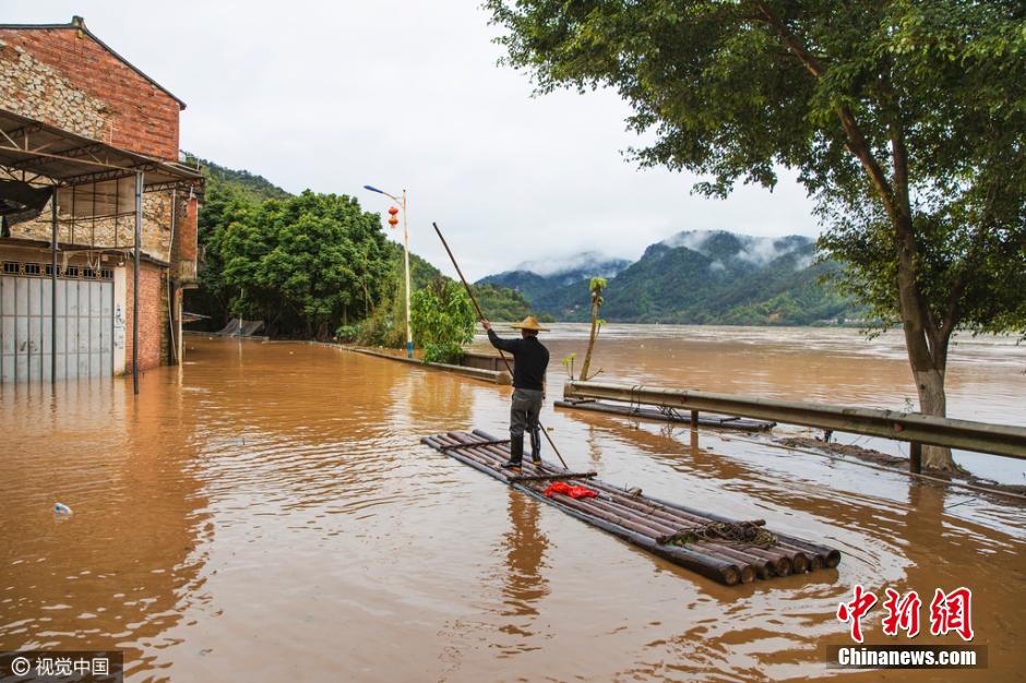 2016年3月23日消息,广东梅州自19日起连日出现强降雨,导致全市5个县(市、区)受灾。大埔县高陂镇通往丰顺县方向的072县道被洪水淹没,村民将竹排“驶上”公路。图片来源:视觉中国