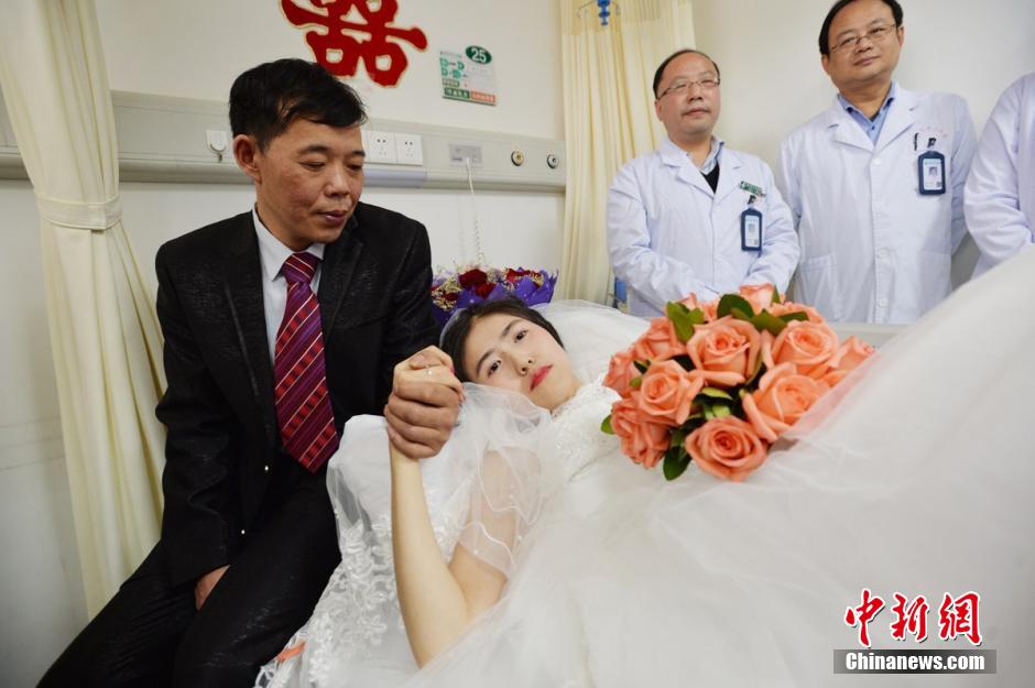 今年2月,杨柳觉得腰部和颈椎痛得人直不起身来,去武汉市中心医院住院,被查出乳腺癌晚期伴随骨转移,已经失去做手术的机会。 彭新跟单位请了长假,24小时照顾女友。彭新每天帮她按摩,喂各种营养汤;陪她看电视,逗她开心。杨柳因为乳腺癌骨转移,颈椎、盆骨等有多地方有转移灶。有时候杨柳痛得大发雷霆,彭新也一直安慰:“你骂我,只要你不疼,怎么骂我都行!”经过近一个月的精心治疗,杨柳病情控制的不错。骨头的疼痛感已经基本消除,肿瘤也没有进一步的扩散。 图为病房婚礼。 图片来源:视觉中国