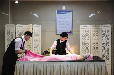 昨日,北京市八宝山殡仪馆首届公众开放日。殡仪服务人员正在通过模特演示遗体沐浴的过程。本版摄影/新京报记者 卢淑婵