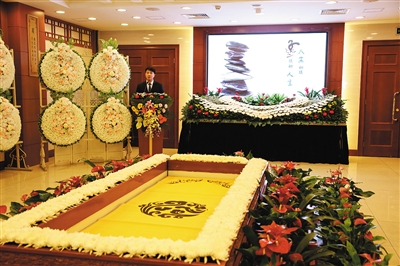 遗体告别是家属对逝者追思的重要环节。八宝山殡仪馆除大礼堂外,还有梅、兰、竹、菊和莲花5个告别厅。在告别厅,八宝山殡仪馆的金牌主持人董子毅展示为一位围棋手举行的告别仪式。