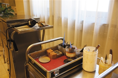 八宝山殡仪馆遗体整容室内陈列的整容时所用的工具。