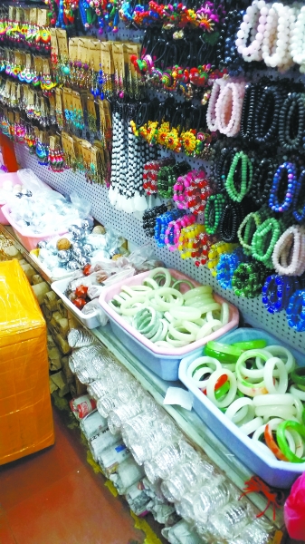 那些在大多数景区都有出售的“玉”手镯,摊位上标价10元一只。在义乌,它们的平均身价约每只1至2元。本着“量大价低”的批发原则,一只“玉”手镯的单价甚至能不到1元。