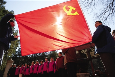 昨日,香山双清别墅,纪念中共中央进驻香山67周年宣传活动上,工作人员在党旗下唱起红色歌曲,怀念革命先辈。