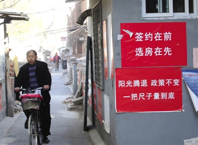 昨日,天坛外,其他准备拆除的简易楼墙体上贴着“签约在前 选房在先”的标语。