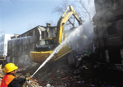 首批拆除的是4栋腾空楼,分别是天坛南里西区2号、3号、7号、8号楼。记者昨日下午在拆除现场看到,施工区域周边拉起安全警戒线,拆楼机、挖土机、环卫车、工作人员等一应到位。2号楼已经被拆的剩下半壁楼体,挖掘机的手臂向左一挥,“轰……”的一声,楼体内的预制板应声断裂,现场激起一阵尘土,外围的工人师傅赶紧举起水龙带向施工区喷水降尘。