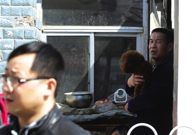 昨日,简易楼的老街坊抱着小狗围观拆除工作。