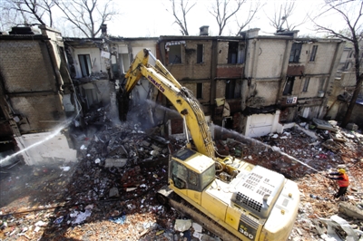 昨日,拆楼机对楼体进行拆除,工作人员朝着楼体表面喷水减少扬尘。