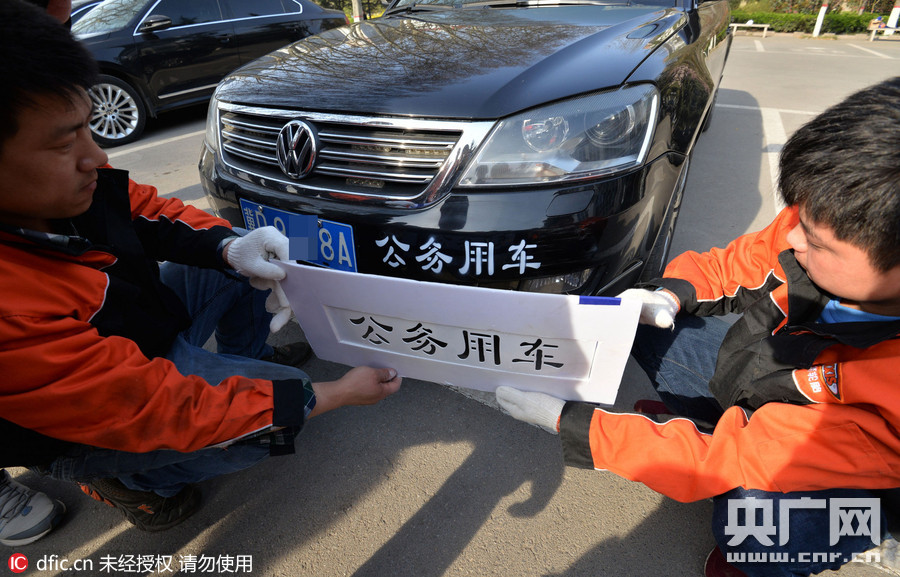 3月28日,在河北省邯郸市市委大院,工作人员在为一辆公务用车喷涂标识。