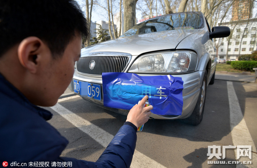 3月28日,在河北省邯郸市市委大院,工作人员在为一辆公务用车喷涂标识。