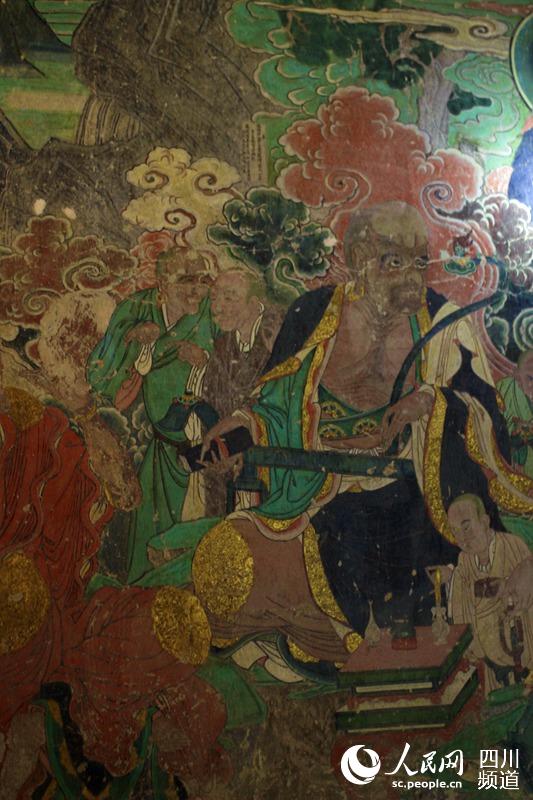 “宝梵壁画作为四川四大壁画之一,距今已有530多年历史。”蓬溪县文广局局长代文益告诉记者,宝梵壁画为工笔重彩贴金彩绘,笔法灵动飘举,人物栩栩如生,用色经久不衰,美术界评论它“具有唐代吴道子的画风”,即具有“天衣飞扬,满壁风动”的特点。