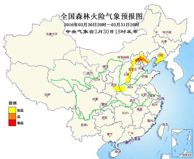 预计,2016年3月30日20时至3月31日20时,北京北部、河北北部和西部、山西东部、陕西东南部、河南西部、辽宁东部等地的部分地区森林火险气象等级较高,其中,北京北部、河北北部的局部地区森林火险气象等级高。请各有关单位严加防范,加强火源管理,确保林区安全。