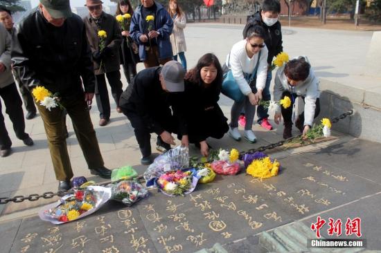 3月31日,辽宁沈阳,民众来到沈阳抗美援朝烈士陵园纪念碑前祭奠英灵。当日13时许,第三批36具在韩国的中国志愿军烈士遗骸运抵沈阳抗美援朝烈士陵园。此前,韩方已向中方移交505具中国军人遗骸。中新社记者 孙昊声 摄