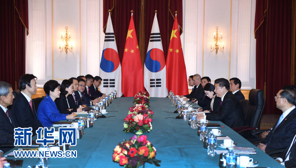 朴槿惠表示,赞同习近平主席对韩中关系的评价。韩中保持密切的高层交往是两国关系重要性的体现。韩方高度重视对华关系,愿在深化互信的基础上推动韩中战略合作伙伴关系不断向前发展,赞同双方加强高层战略沟通,并在各层级、各领域密切交流。在当前全球经济形势下,韩中双方更有必要加强经贸等领域务实合作,加快实施韩中自贸协定,实现“欧亚合作倡议”同“一带一路”建设对接。韩方支持密切韩中人文交流,相互支持办好平昌冬奥会和北京冬奥会。