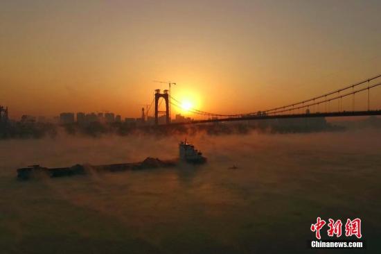 资料图:在“三峡门户”湖北省宜昌市,长江江面上“热气蒸腾”,过往船只犹如穿行在仙境般的云雾之中。周星亮 摄