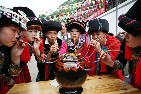 彝族咂酒。百里杜鹃彝族儿女热情好客,用吸管同引一缸咂酒,拉近远朋的距离