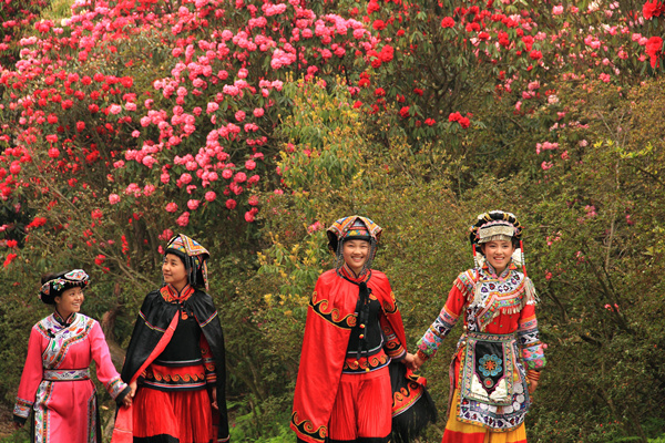 索玛花开。每年杜鹃花盛开的季节,当地的彝族、苗族少数民族同胞都会着上民族盛装祭花神