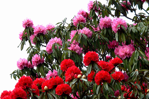 每年3、4月份是杜鹃花的盛花期,满山遍野杜鹃花似雪球,有彩红、淡红、桃红、紫红、淡紫、彩黄、淡黄、雪白、乳白等颜色,色彩斑烂,热情似火,一朵朵花,一片片地,沉浸在山乡。