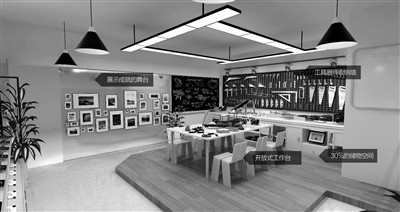 “肯·创客空间”团队认为创客空间应该由空间、课程、工具、活动四方面组成。首先,要为学生提供一个开放式、共享式的工作室,其次,课程是创客教育最核心部分,要培养学生将想法变为现实的创客思维。创业课程不是传统形式的课程,而是玩中学、做中学。此外,创客的精神在于分享、互助。图为“肯·创客空间”为学生打造的创客空间。