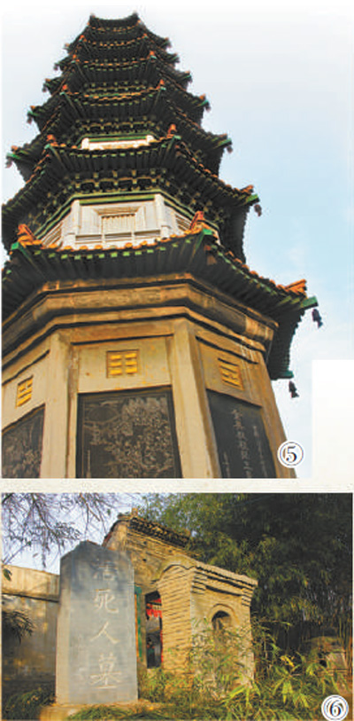 新中国成立以来,在社会各界关心下,陆续修复重建了重阳宝殿、钟鼓二楼、重阳塔(图⑤)、白云灵祠及祖师仙茔等建筑,近40通道教碑石也得到了集中妥善保存,其中就包括王重阳祖师及七真画像碑、王重阳书写的《如梦令》诗词碑、元代皇帝圣旨碑、元代赵孟頫书写的《大元敕藏御服之碑》等。
