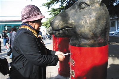 “妈,您收好了。”对着一只一米长的有牛头雕像的邮筒,陈女士将写给母亲的许愿卡投递进邮筒,对着邮筒深深地鞠了三个躬。这是今年八宝山人民公墓推出的新祭扫方式:生肖许愿卡。在业务厅北侧楼前树立着有十二座兽首雕像的“时空邮箱”供市民投递,然后再由工作人员统一焚烧许愿卡。