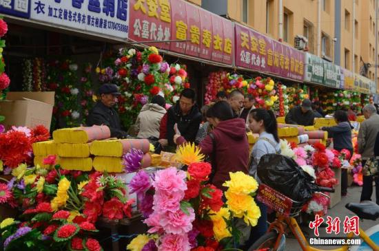 4月2日,市民购买殡葬用品。清明将至,呼和浩特殡葬市场销售进入旺季,多种殡葬用品摆摊出售。记者 刘文华 摄