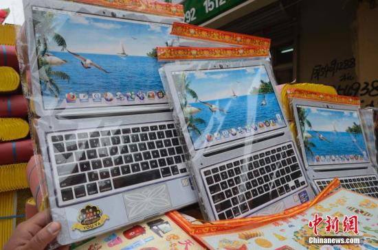 4月2日,仿制笔记本电脑的殡葬用品。清明将至,呼和浩特殡葬市场销售进入旺季,多种殡葬用品摆摊出售。记者 刘文华 摄