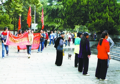 2日上午10点,前往施洋烈士墓祭奠的大学生与在此处晨练的市民相遇。记者杨涛 实习生孟浩荡 摄