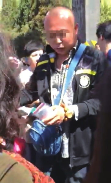 昨日,一名黄牛在玉渊潭公园门口“倒票”。