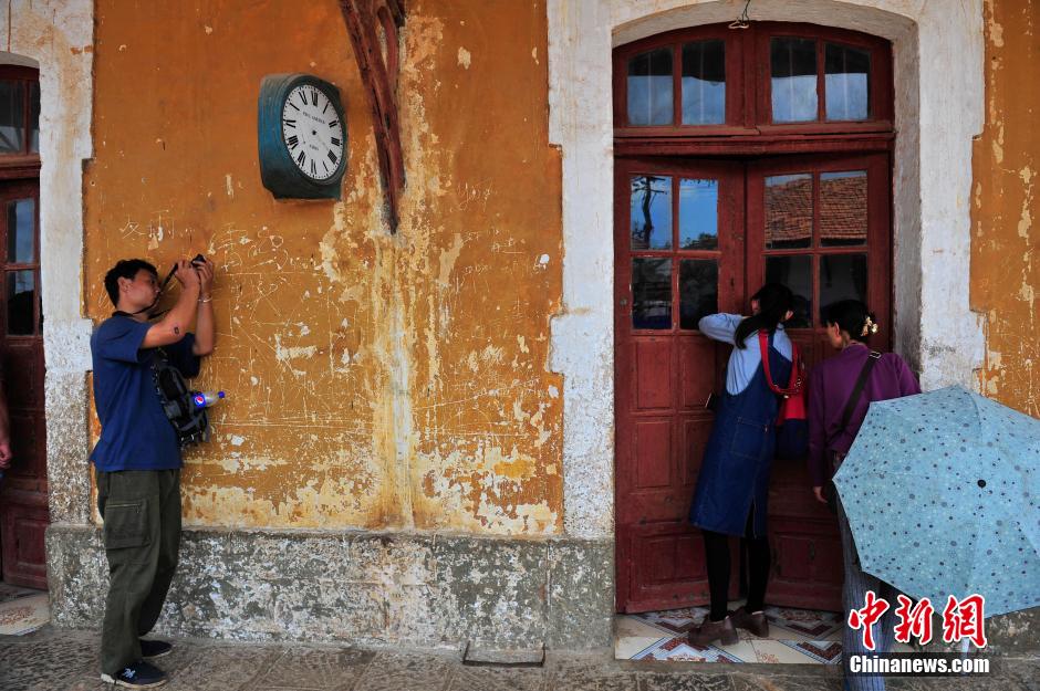 4月3日,游客在拍摄火车站的标志物三面钟的子钟。清明小长假期间,云南蒙自市碧色寨火车站独特的法式建筑风格,吸引众多游客到此游览。滇越铁路于1910年建成,碧色寨火车站成为这条铁路的核心枢纽,是中国最古老的火车站之一。 记者 刘冉阳 摄