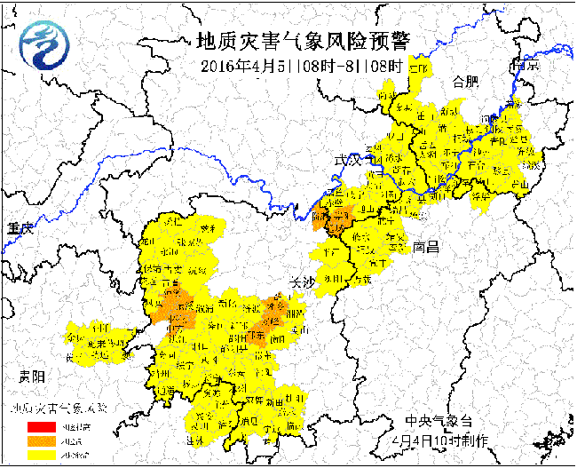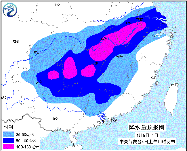 预计4月5日至7日,受冷暖空气共同影响,江汉、江淮、江南大部及广西北部和广东北部、重庆东部、贵州东部将出现大到暴雨,大部地区累计雨量50~120毫米;其中湖北东部、安徽沿江地区和大别山地区、湖南中北部、江西西北部、贵州东北部等局地有大暴雨(日雨量100~130毫米),累计雨量可达150~180毫米;最强降水时段出现在5日夜间至6日白天。贵州、湖南、湖北、安徽等地部分地区最大日雨量可接近或达到4月日雨量极值。